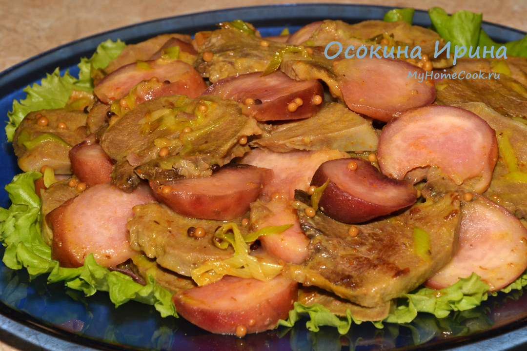 4 свиных языка отварила с добавлением соли, душистого перца и перца горошком в течение полутора часов, переложила в миску, охладила под проточной водой, очистила от кожи и порезала тонкими ломтиками поперёк. В сотейнике распустила топлёное сливочное масло, обжарила 2 резаных кольцами стебля порея, добавила 1 ч.л. смеси карри из мельнички, промешала, прогрела, добавила подготовленные языки, обжарила, помешивая, затем добавила 3 ст.л. натурального йогурта, снова промешала, прогрела, добавила 7 инжирных персиков, ломтиками, обжаривала, помешивая, пару минут, добавила 1 ч.л. с верхом зернистой горчицы, снова промешала и через минуту подала. Быстро, просто и ооочень вкусно получилось)
